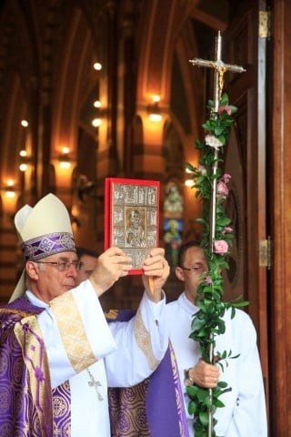 O rito iniciou no Santuário Eucarístico Diocesano – Igreja Nossa Senhora do Rosário e São Benedito, de onde os fiéis saíram em procissão em direção à Catedral, no centro da cidade.