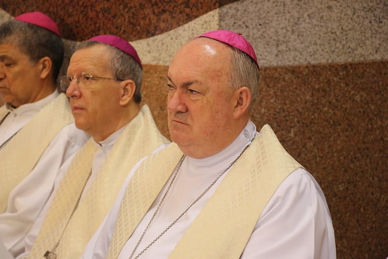 “Peregrinos da Esperança”, os bispos do Brasil, reunidos em Assembleia Geral, entoaram o hino para o Ano Jubilar 2025 durante Missa celebrada no Santuário Nacional de Aparecida na terça-feira, 16 de abril. “Toda a língua, povo e nação tua luz encontra na Palavra. Os teus filhos, frágeis e dispersos se reúnem no teu Filho amado”, cantaram os presentes. Presidida pelo arcebispo de Goiânia e primeiro vice-presidente da CNBB, dom João Justino de Medeiros Silva, a Celebração Eucarística marcou o início dos trabalhos do sétimo dia de Assembleia. Dom Pedro Carlos Cipollini, bispo diocesano de Santo André, foi um dos bispos concelebrantes principais da Missa.