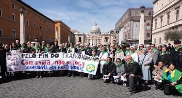 A Caminhada Penitencial teve início com a celebração da Santa Missa presidida pelo Pe. Paulo Suess, que na última sexta-feira foi recebido em audiência, juntamente com Dom Erwin Kräutler, pelo Papa Francisco. Após, o grupo percorreu as ruas de Roma meditando as estações da Via Sacra da Fraternidade. Ao chegar à Via da Conciliação, que dá acesso à Praça São Pedro, o grupo meditou a última estação e realizou um ato contra o tráfico de pessoas – tema da Campanha da Fraternidade deste ano – e o turismo sexual internacional. Ao assomar à janela do apartamento pontifício, que dá para a Praça São Pedro, o Papa Francisco foi acolhido com bandeiras verde-amarelas. Ao final da oração o Papa se dirigiu em especial aos brasileiros: “Saúdo o grupo brasileiro ‘Fraternidade e Tráfico Humano’”, momento em que foi levantada a faixa que acompanhou toda a caminhada e que revela um grito profético contra o tráfico humano e o risco de turismo sexual durante a Copa do Mundo: “Com a vida não se joga”! Após o Angelus, o grupo cantou canções religiosas brasileiras contagiando os presentes. (GE -JE)