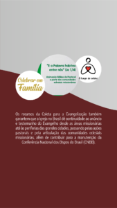 Os recursos da Coleta para a Evangelização garantem que a Igreja no Brasil dê continuidade ao anúncio e testemunho do Evangelho desde as áreas missionárias até às periferias das grandes cidades, passando pelas ações pastorais e pela articulação das comunidades eclesiais missionárias, além de contribuir para a manutenção da Conferência Nacional dos Bispos do Brasil (CNBB).