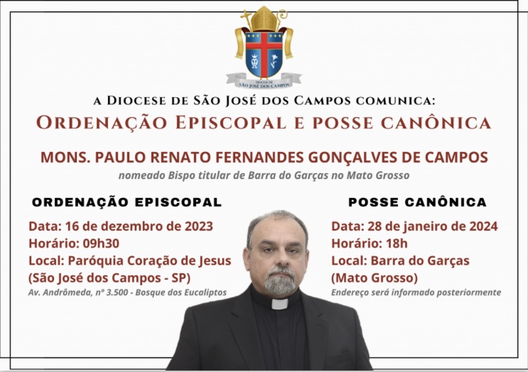 Diocese de São José dos Campos, anuncia as datas de Ordenação Episcopal e Posse Canônica do Monsenhor Paulo Renato Fernandes Gonçalves de Campos 26/10/2023 Leia Mais