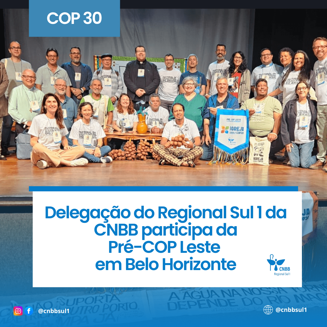 A delegação do Regional Sul 1 da Conferência Nacional dos Bispos do Brasil (CNBB) participou da Pré-COP Leste, que ocorreu em Belo Horizonte (MG). O encontro reuniu representantes dos regionais Sul 1 (São Paulo), Leste 1 (Rio de Janeiro), Leste 2 (Minas Gerais) e Leste 3 (Espírito Santo), em preparação para a COP30, marcada para 2025 em Belém (PA).
