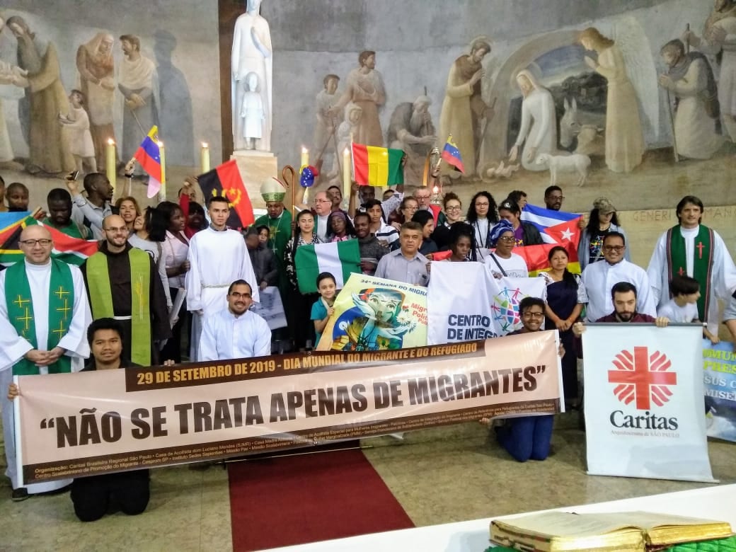 Com o Lema “Não se trata apenas de Migrantes”, neste domingo (29), cerca de 200 pessoas, entre imigrantes, refugiados/as, religiosos/as, estiveram nas escadaria da Catedral da Sé, com cartazes, musicas, depoimentos, dança, ao lado dos inúmeros moradores de rua que ali estavam. Em caminhada, imigrantes de vários países do mundo, com suas bandeiras, pelo direito de serem tratados com dignidade. Pessoas de Bolivia, Venezuela, Chile, Paraguai, Haiti, Perú, Colombia, e países da África, felizes por estarem juntos lutando pelos mesmos ideais. Chegando na Paróquia Nossa Senhora da Paz, situada no bairro do Glicério, onde atua a “Missão Paz”, dos padres scalabrinianos, celebrou-se, com a igreja lotada, a missa preparada pela coletividade paraguaia, presidida por Dom Eduardo Vieira dos Santos, bispo auxiliar da Região Sé, Arquidiocese de São Paulo.