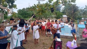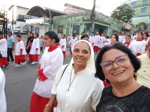 Chegando em Tefé, fomos recepcionados no aeroporto pela secretária da coordenação de pastoral da Prelazia, Francisca Andrade, e pelo jovem da Pascom, Antônio Sabóia. Após a acolhida, nos levaram para a procissão do Senhor Morto, que contava com um grande número de fiéis das paróquias da cidade de Tefé. Nesta caminhada, o bispo da Prelazia também estava presente e nos acolheu com um afetuoso abraço e votos de boas-vindas e feliz missão.