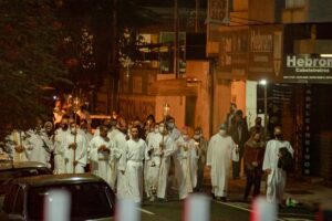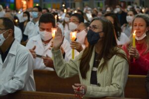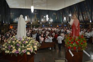 Concluída a caminhada, que contou com a meditação da irmã Ednalva Gomes da Silva e animação de lideranças leigas, os fiéis lotaram as dependências da Catedral para uma Vigília Eucarística. Dom Vilar, que acompanhou o povo durante todo o trajeto ao lado na imagem do Sagrado Coração de Jesus, proferiu a bênção com o Santíssimo (fazendo uso de ostensório confeccionado para o Congresso Eucarístico celebrado na Diocese de São José do Rio Preto na década de 1940). “Jesus revela o amor em nossos corações. Ele é o Pão da Vida”, destacou o epíscopo ao pedir que os diocesanos sigam buscando o diálogo que gera a paz e rezando pela saúde do Santo Padre.