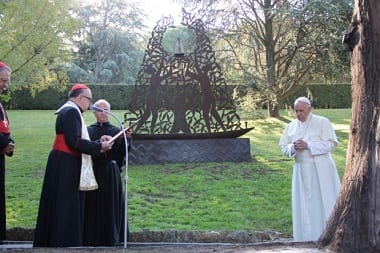 Nesta oportunidade, não posso deixar de fazer uma menção especial ao Sr. Cláudio Pastro, que não pôde, infelizmente, comparecer a este ato. Responsável pela concepção artística da escultura, Cláudio Pastro é o maior representante vivo da Arte Sacra no Brasil. Seu nome está fortemente associado ao Santuário Nacional de Nossa Senhora Aparecida, onde inúmeras obras de sua autoria podem ser apreciadas. É ele o encarregado do projeto artístico daquele templo, que se encontra em fase de conclusão.  Cláudio Pastro é reconhecido pelo alto valor de suas criações artísticas e pelo trabalho realizado em diversos países. Seu nome, a partir de agora, passa a ser  lembrado também por esta belíssima escultura, que se manterá erguida nestes Jardins do Vaticano.