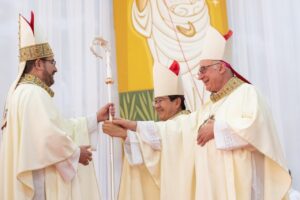 Após a calorosa acolhida, ele recebeu das mãos de um leigo, um seminarista e de um presbítero as insígnias pontificais do Bispo, que são: o anel, sinal de fidelidade e da união com a Igreja; o báculo, símbolo do serviço pastoral; a mitra, habitualmente usada pelo Bispo; a cruz peitoral, que recorda que aonde o Bispo for ele é representante de Jesus Cristo e tem a missão de anunciar o Evangelho.