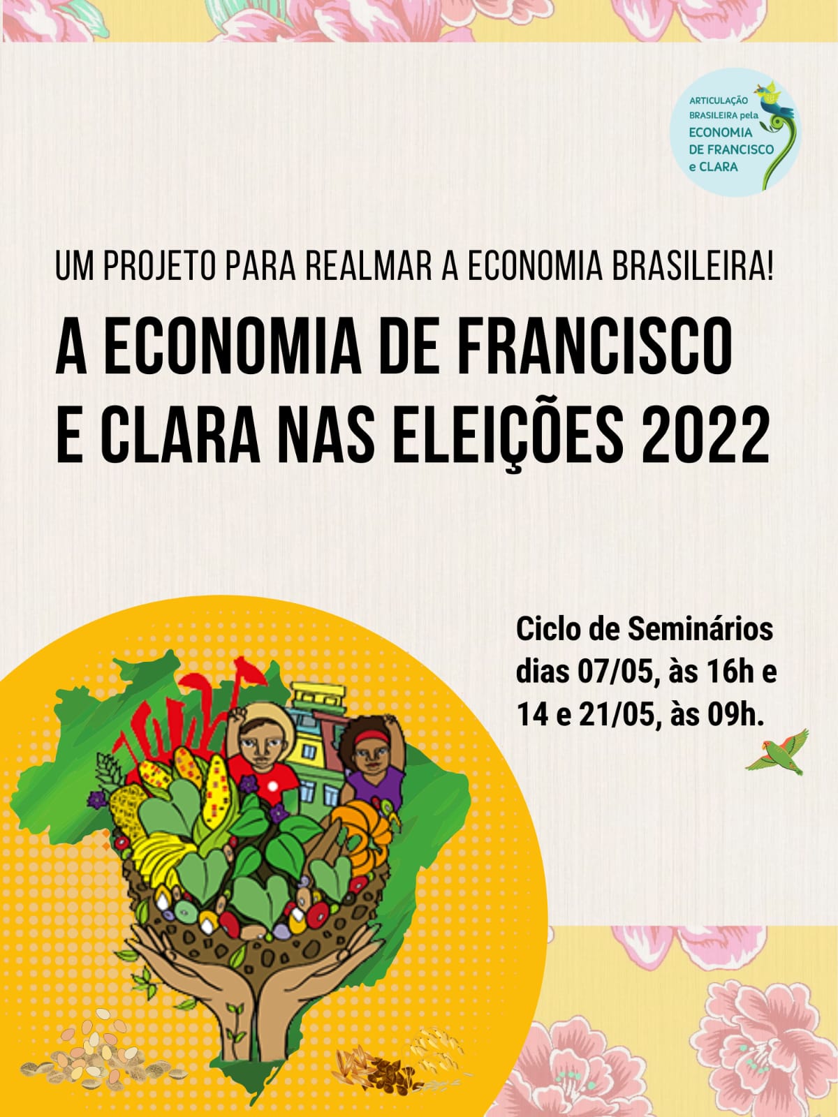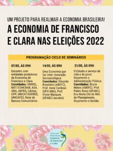 Somos chamados a pensar um projeto onde Economia e Política sejam instrumentos para construção do Bem Comum e do cuidado com a nossa Casa Comum. Nesse sentido, a Articulação Brasileira pela Economia de Francisco e Clara te convida para esse ciclo de seminários, diálogos e construção de uma plataforma econômica sintética a ser utilizada por todas as pessoas engajadas nessa pauta, inclusive, para ser dialogada com candidatos que se comprometam com elas! Para essa construção coletiva promovemos 3 encontros (1, foi no último sábado, mas que serão apresentados posteriormente toda a sistematização):