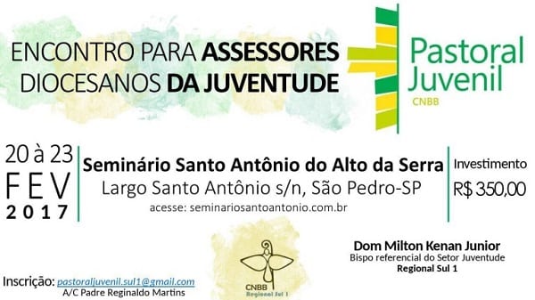 O Setor Juventude do Regional Sul 1 da CNBB preparou e está convidando todos os Assessores Diocesanos para participar do Encontro Regional da Pastoral Juvenil, de 20 a 23 de fevereiro de 2017, no Seminário Santo Antonio, dos Frades Capuchinhos, no Alto da Serra, em São Pedro-SP.