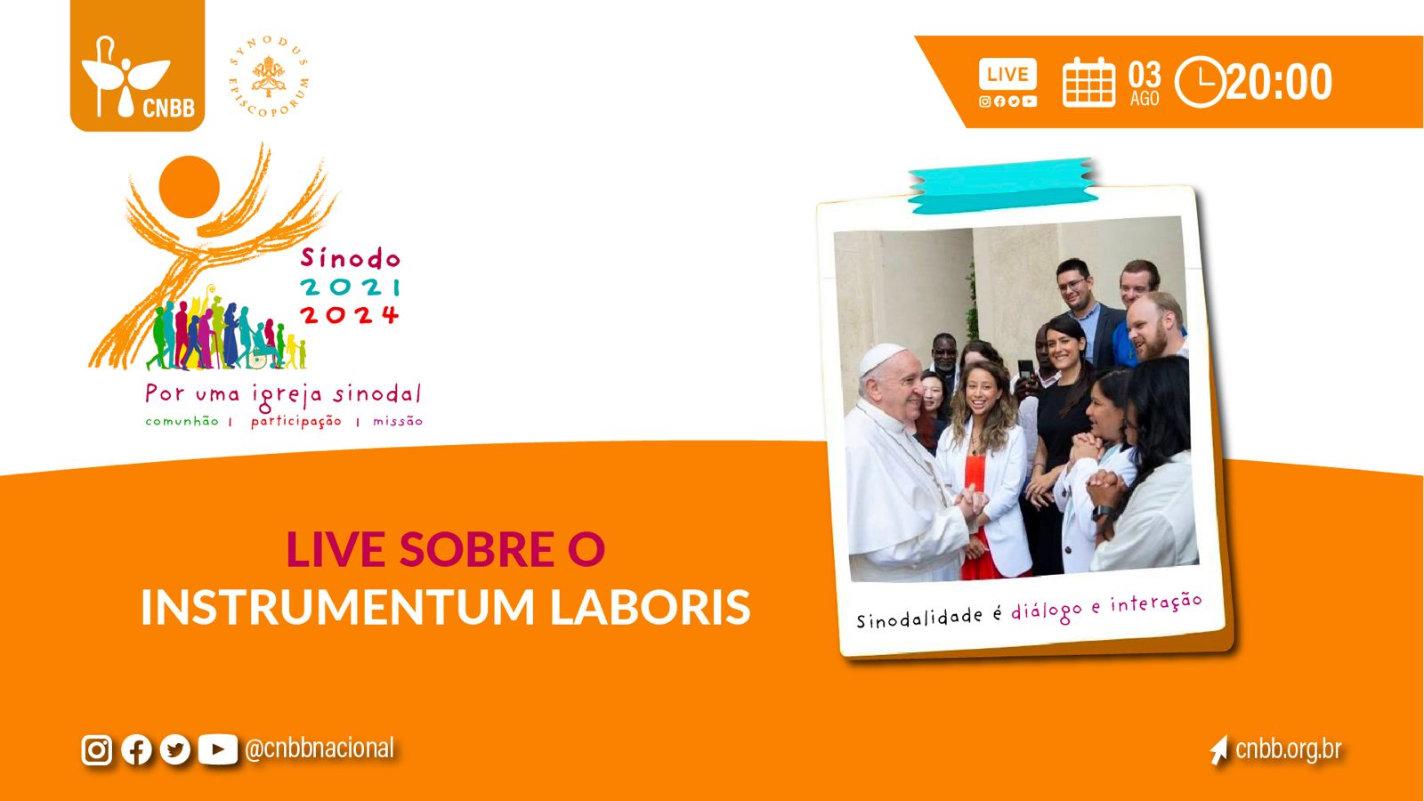 O Grupo de Animação do Sínodo 2021-2024 no Brasil promove no próximo dia 3 de agosto, às 20h, no canal de Youtube da Conferência Nacional dos Bispos do Brasil (CNBB), uma live sobre “Instrumentum Laboris”, o documento sinodal. A live é destinada às equipes diocesanas de animação do Sínodo, mas poderá ser acompanhada por quem desejar sem necessidade de inscrição.