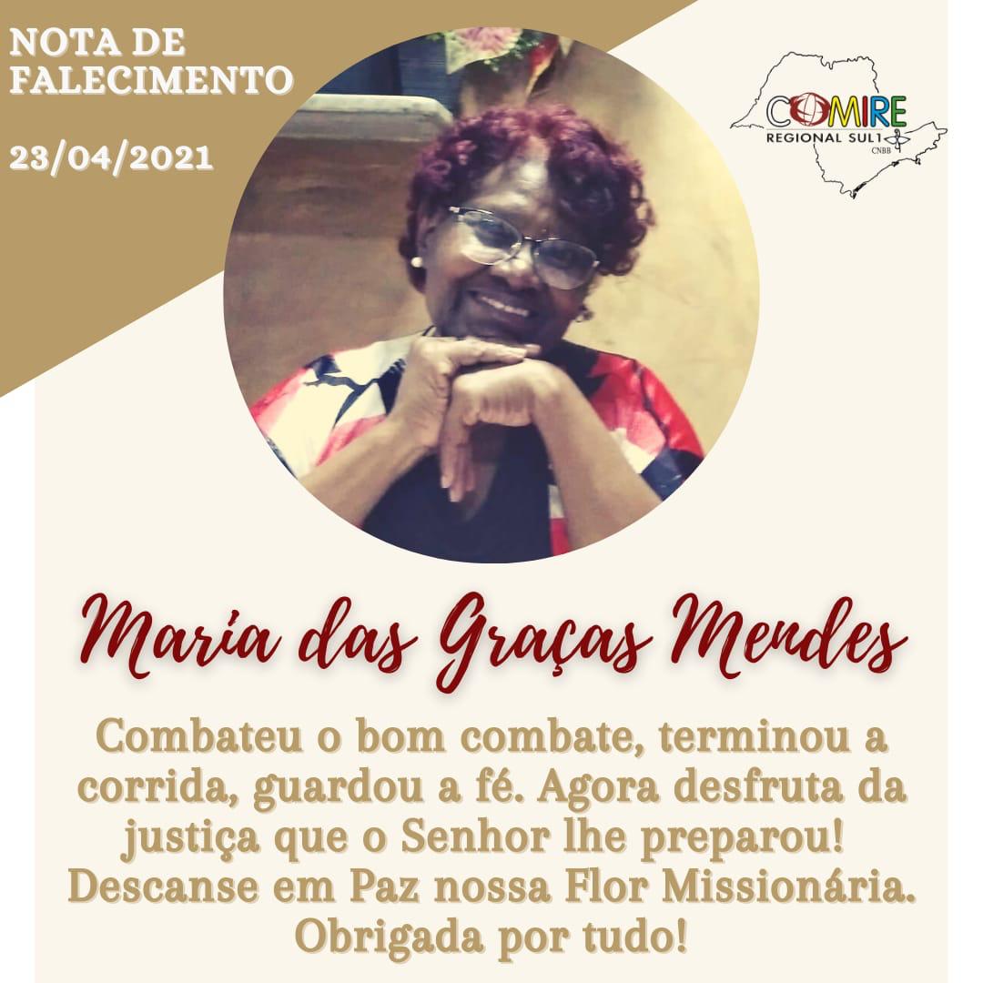 Maria das Graças era da Diocese de Guarulhos. Respondia pela Infância e Adolescência Missionária do Regional há mais de cinco anos e era consagrada do Instituto Missionária Diocesanas de Jesus Sacerdote. O COMIRE fala com carinho da coordenadora: “Sempre com um sorriso largo, espontâneo e presença humilde, marca da sua missionariedade, foi sinal da Alegria do Evangelho e do Amor de Deus. Descanse em paz! E, junto com Fatiminha, interceda por nós.”