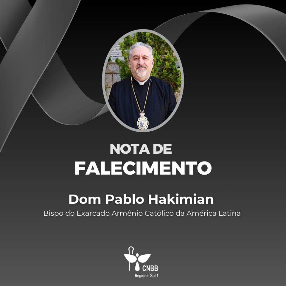 A Presidência do Regional Sul 1 emitiu uma nota de pesar pelo falecimento de Dom Pablo Hakimian, Bispo dos Armênios Católicos da América Latina e membro da Conferência Nacional dos Bispos do Brasil (CNBB). Com profundo pesar e esperança na ressurreição, recebemos a notícia de sua partida.