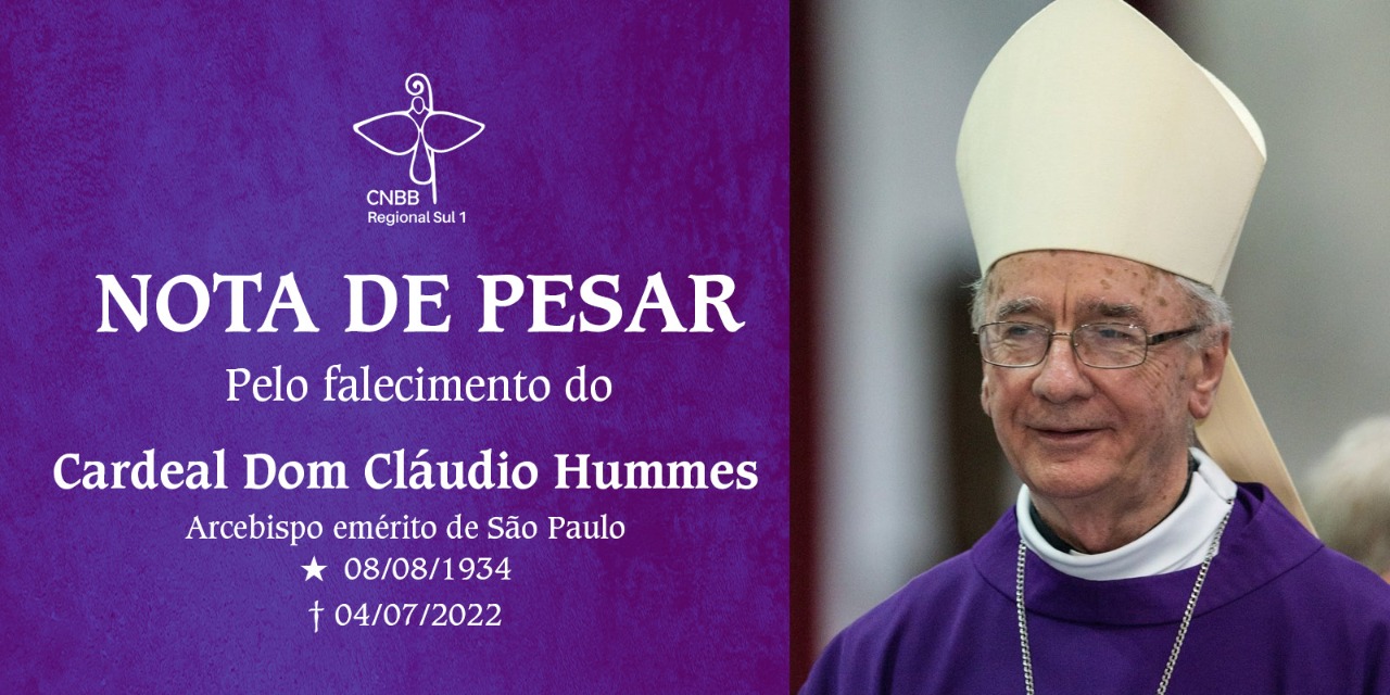 O Regional Sul 1 da CNBB recebeu com pesar a notícia de falecimento do Cardeal Dom Cláudio Hummes, Arcebispo emérito de São Paulo, dia 4 de julho. Manifestamos as mais profundas condolências ao Sr. Arcebispo, Cardeal Dom Odilo Pedro Scherer, ao presbitério, e a todo o povo de Deus da Arquidiocese de São Paulo, unindo-nos em oração em sufrágio pela alma do querido Dom Cláudio Hummes.